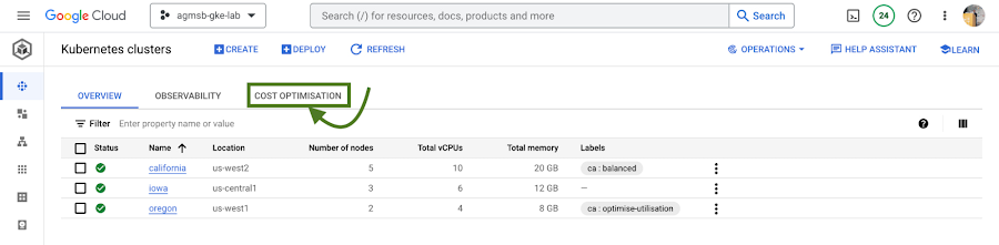 如果你不知道从哪里开始优化集群,最好的起点是寻找一个突出的大问题。通过查看跨越所有集群的视图,分析现有情况。在 GKE 中,谷歌在控制台中内置了一个集群级成本优化选项卡,其中包含丰富的信息,以避免用户自己收集而带来的麻烦。