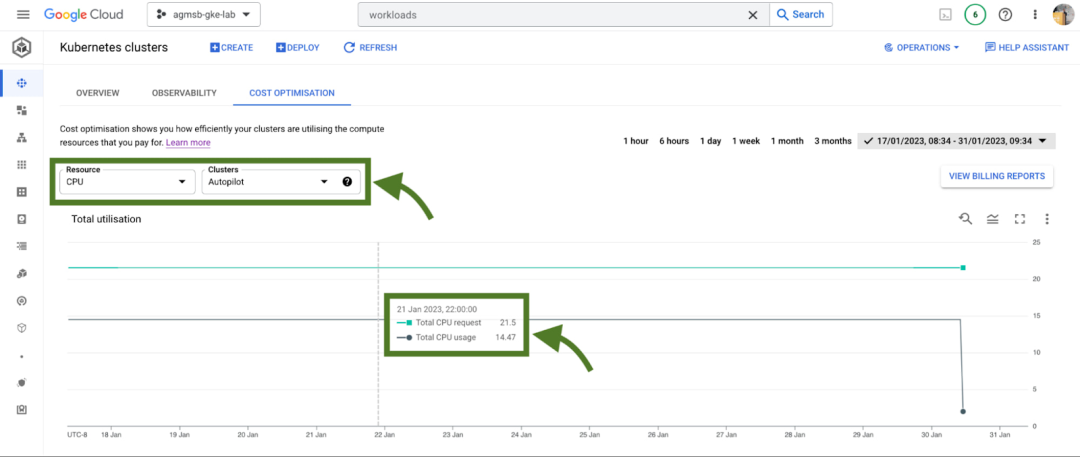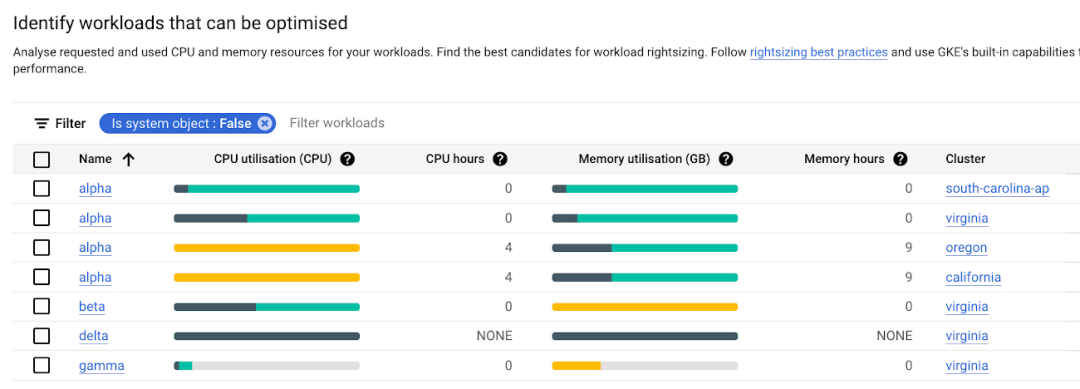 一旦你确定了你可能想要与之合作的团队,GKE 会在工作负载级别提供一个成本优化选项卡,然后你可以在其中开始向下钻取并确定可以通过称为“工作负载调整大小”的练习来优化的特定工作负载.这是确保 Pod 请求更接近地反映其预期用途的行为。