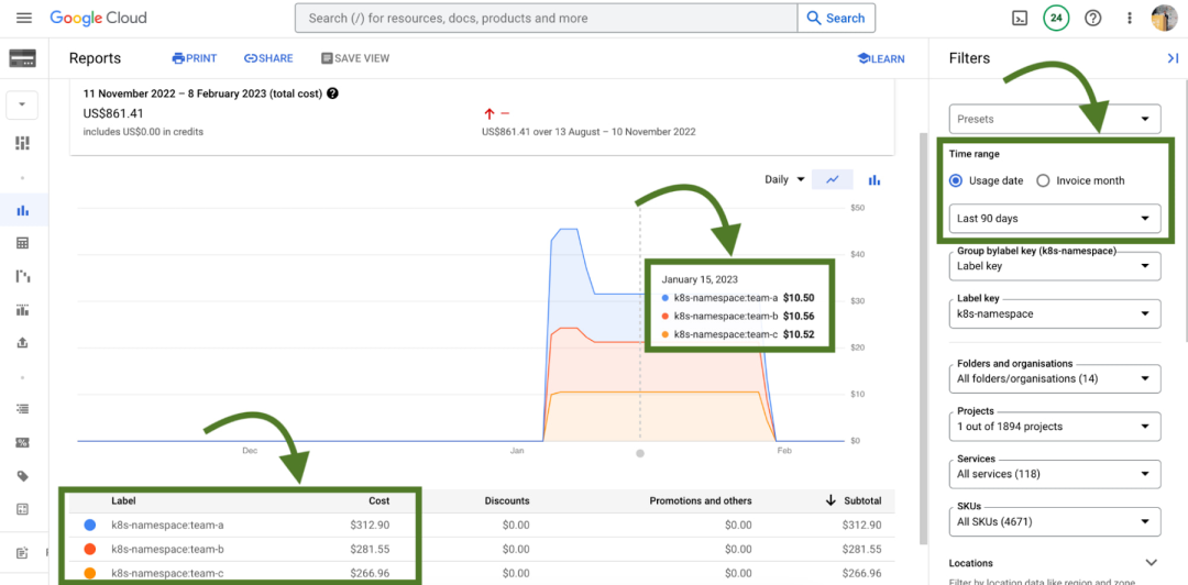 GKE 成本分配是一项原生 GKE 功能,它将工作负载使用情况与 Cloud Billing 及其报告集成在一起,使你不仅可以在每个集群级别,而且可以在每个 Kubernetes 命名空间或每个 Kubernetes 标签级别查看和提醒计费。