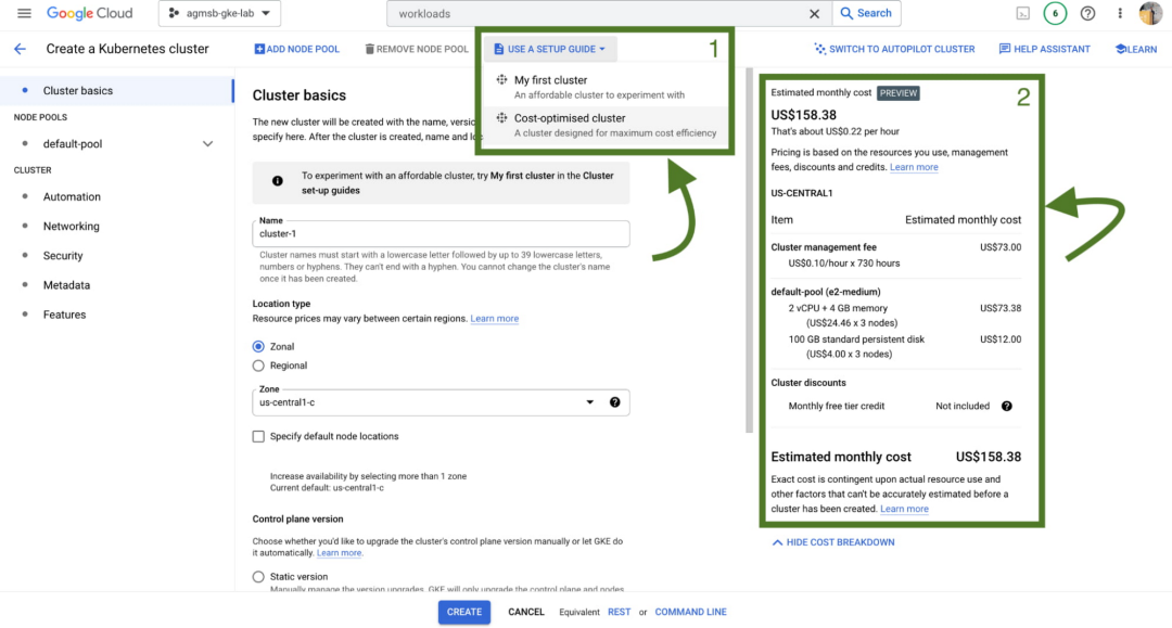 首先,我们有一个设置指南,可以帮助你创建一个固定的 GKE 标准集群,其中已经启用了我们在此讨论的一些功能,例如 GKE 成本分配和 Vertical Pod Autoscaler。