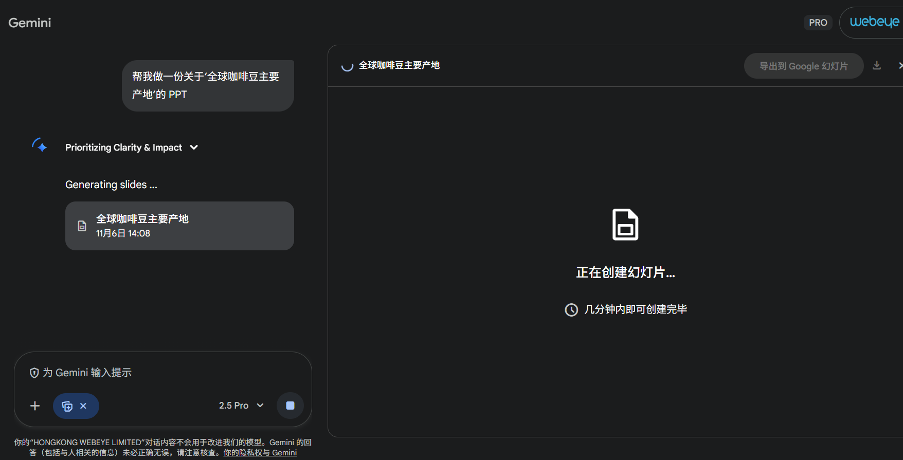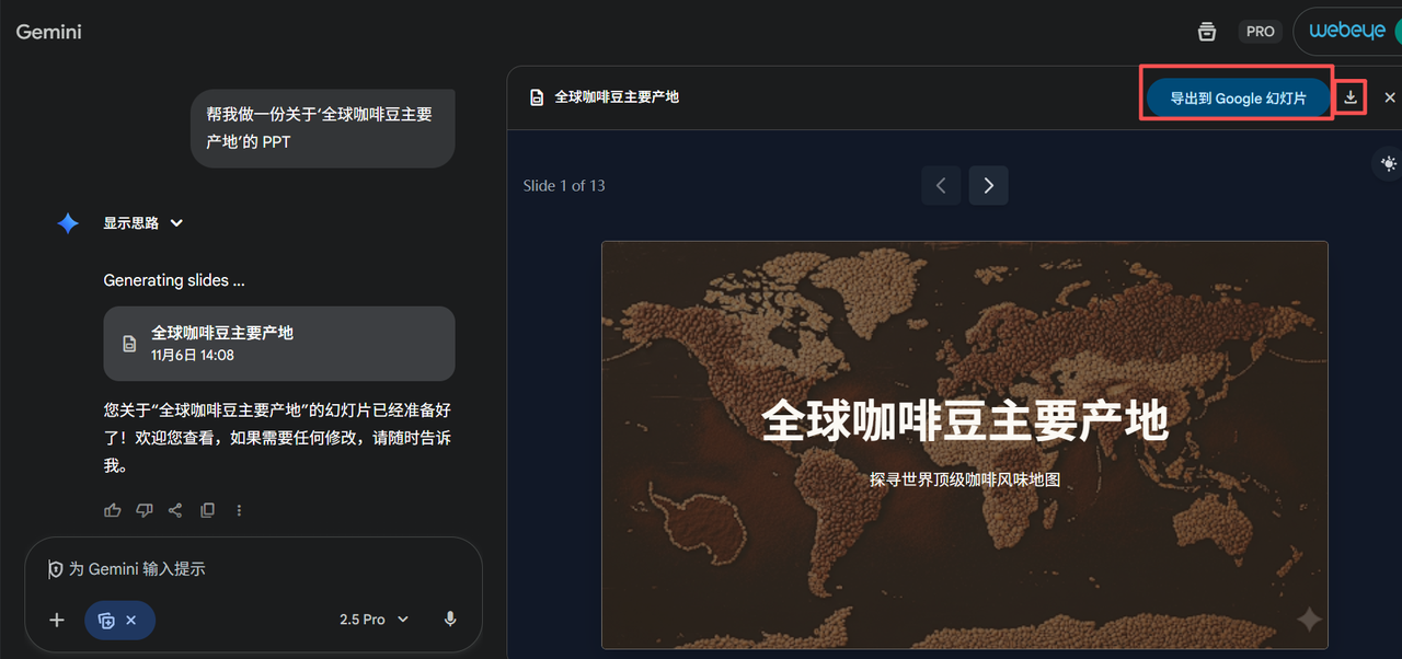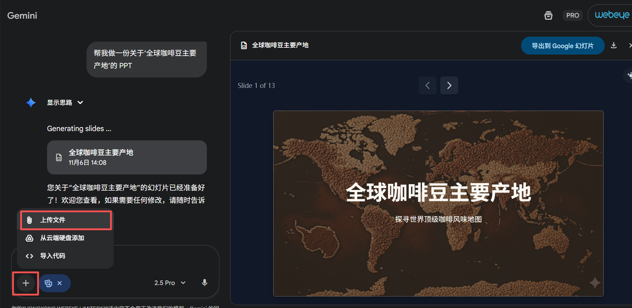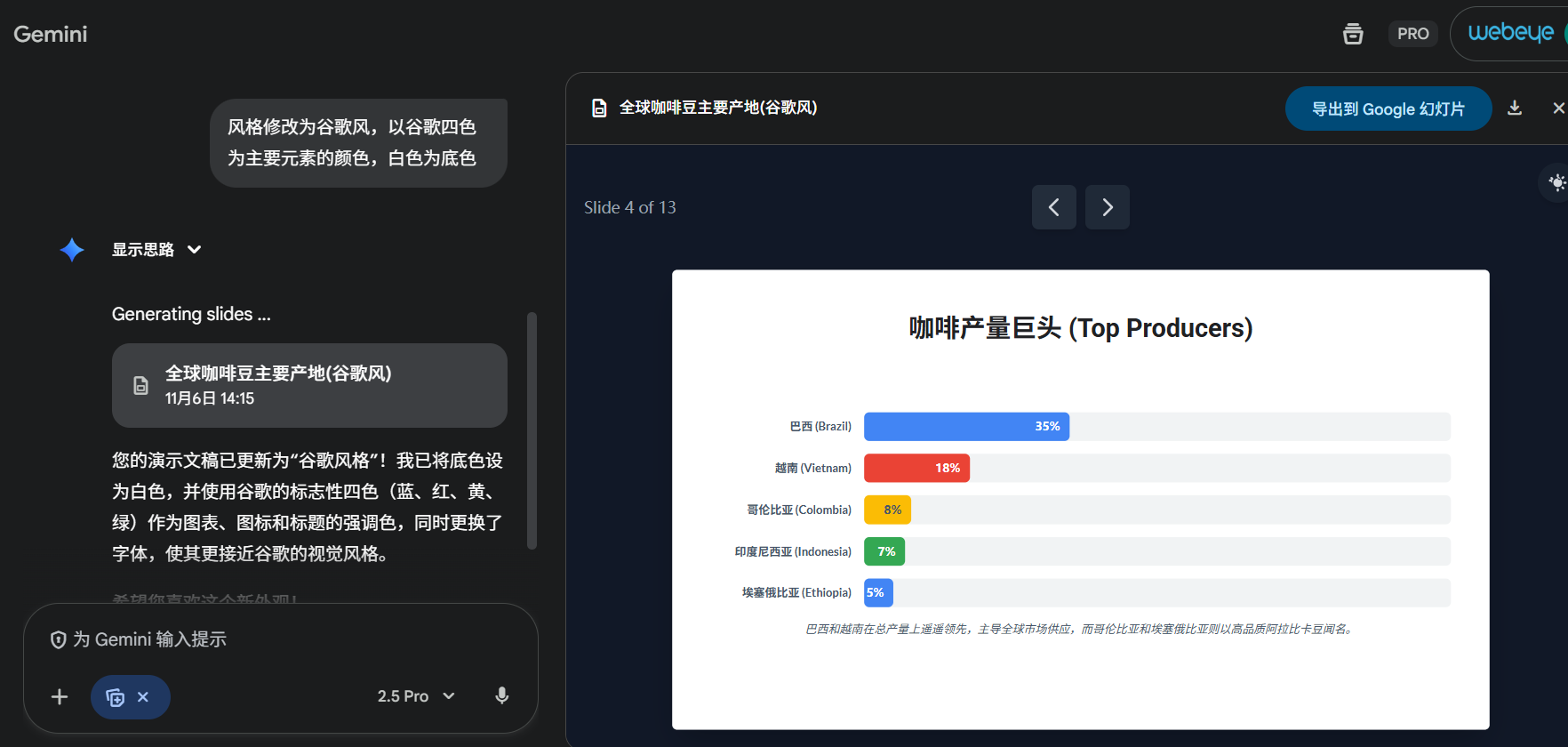 如果你脑中只有一个模糊的主题,直接让 Gemini 帮你搜。比如输入:“帮我做一份关于‘全球咖啡豆主要产地’的 PPT”。Gemini 会利用谷歌搜索,自动搜集资料并填充内容。