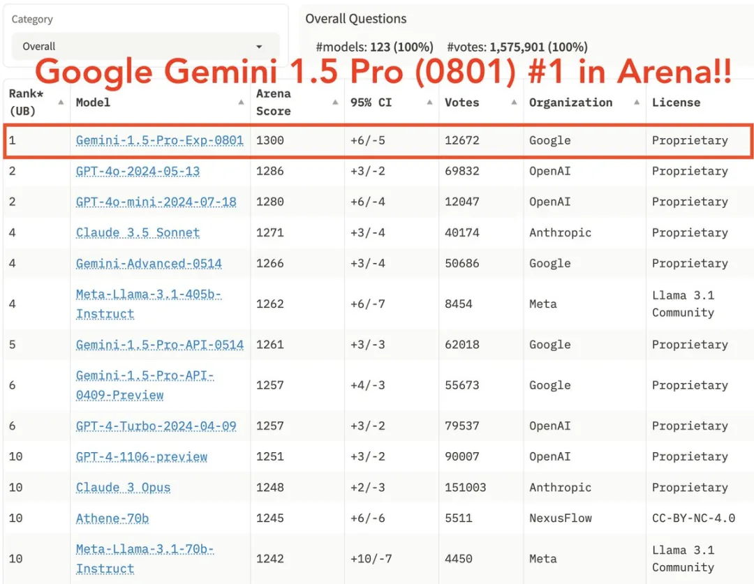在这个日新月异的 AI 时代,每一次技术突破都可能引发行业的剧烈震动。近日,Google 的一则消息无疑在 AI 界投下了一颗重磅炸弹——Google 于8月1日发布了其实验版模型 Gemini 1.5 Pro,并在 Chatbot Arena 排行榜上一举夺魁,打破了 GPT-4 和 Claude 长期以来的双雄争霸格局。
