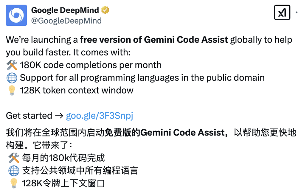 Gemini Code Assist 提供了每月 180,000 次代码补全的额度,远超其他免费工具的 2,000 次限制。这意味着,即使是每天疯狂写代码的程序员,也很难用完这个额度。