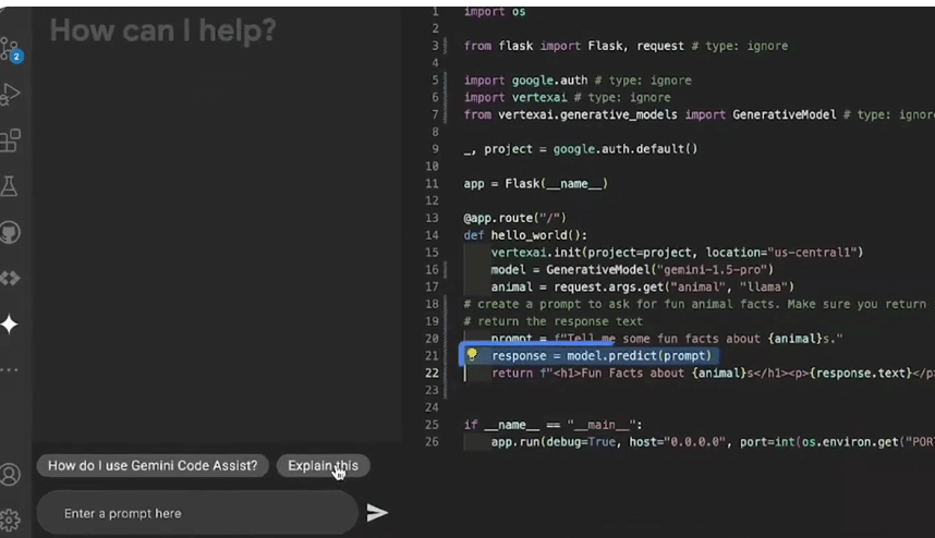 在 VS Code 和 JetBrains IDE 中,开发者可以直接向 Gemini 提问编程相关问题。例如:“如何用 Node 请求 AI 接口数据?”Gemini 会即时生成相应代码,并自动读取本地文件提供的上下文。